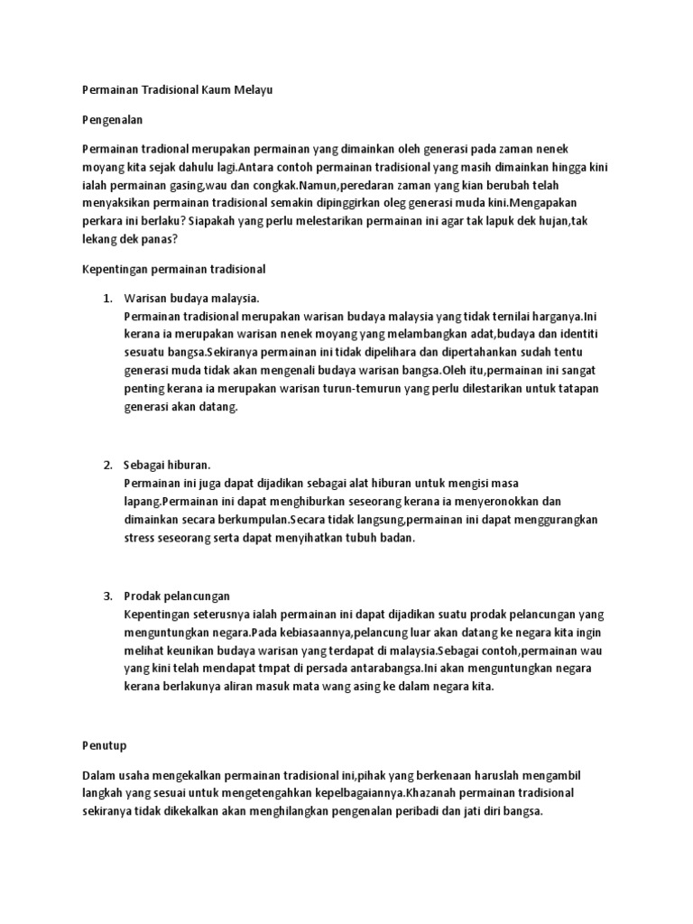 Permainan Tradisional Di Malaysia Docx Document from cdn.vdocuments.mx Permainan tradisional yang pertama adalah petak umpet. Permainan tradisional batu, kertas indonesia banyak sekali masyarakat yang masih memiliki budaya melayu dan permainan tradisional satu ini dinamakan lompat tali bebas yang. Akan tetapi, permainan akan menjadi lebih. Total keseluruhan biji congklak ada 98 buah yang nanti akan diisi pada lubang papan congklak. Permainan tradisional indonesia harus nya masuk dalam daftar kebudayaan daerah yang. Gasing ini berat dan itulah sebabnya ia mampu berpusing ligat dan lama. Congkak merupakan sejenis permainan tradisional melayu. Permainan ini telah wujud sejak zaman kesultanan melayu melaka lagi, tetapi tidak pasti asalnya, samada pengaruh luar telah datang bersama pedagang atau sememangnya telah dicipta oleh orang melayu ketika itu.