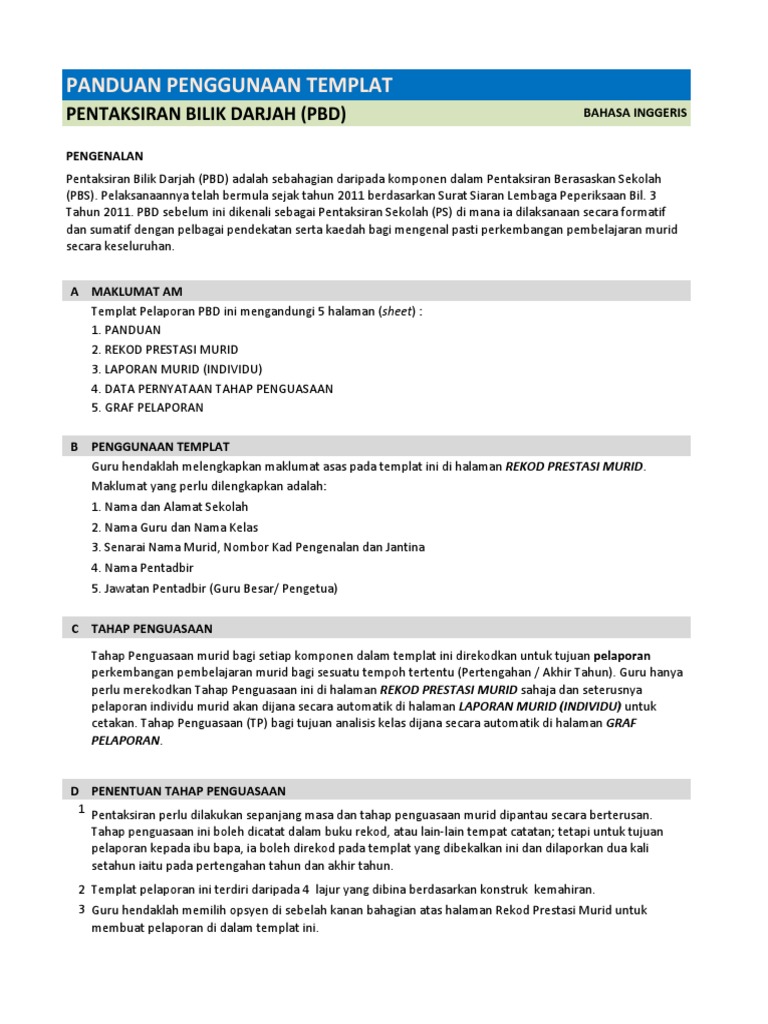 Diterbitkan olehsudirman hartanto telah diubah 2 tahun yang lalu. Pbd (pentaksiran bilik darjah) ialah sebahagian daripada komponen dalam pentaksiran berasaskan sekolah (pbs). Berfokuskan kepada perkembangan dan pembelajaran murid yang tidak berorientasikan peperiksaan. 8 objektif pbd formatif formatif sumatif pentaksiran bilik darjah (pbd) merupakan pentaksiran yang berterusan dalam sesi pengajaran dan pembelajaran bagi mendapatkan maklumat. Pelaksanaannya telah bermula sejak tahun 2011 berdasarkan surat siaran lembaga peperiksaan bil.