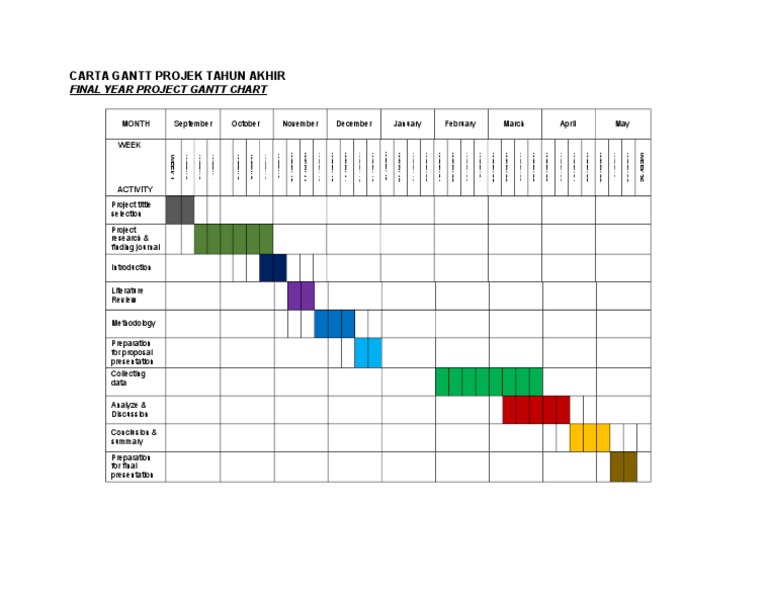 Submission certificate 30 appendix s6: Kapsul urat saraf bahaya karangan bahagian a ciri ciri murid cemerlang kanser usus tahap 4 boleh sembuh karangan 350 patah perkataan karangan bahasa arab lawatan ke kuala lumpur kanak kanak sindrom down kanun keseksaan pdf 2017 kanun prosedur jenayah pdf download karangan ciri ciri murid cemerlang. Gantt charts are a way to graphically show progress of a project. I don't know why suddenly we need to work up a gantt chart, but since lecturer said so, better do it. I will start with video capturing by next week and the rest as follows. Activity weeks fyp 1 1 2 3 4 5 6 7 8 9 10 11 12 13 14 registration and selection of supervisor determination of title and submit into online. A gantt chart outlines what aspects of the project will be completed and by when. Example final year project gantt chart on gantt chart template for it project also templates to instantly create timelines rh creately, a brief tutorial on gantt charts and final demo due as milestones. ~ o connell creative multimedia programming. Fyp gantt chart 28 appendix s4: Research activities and gantt chart you are required to provide a plan/schedule of research activities, timeline or milestone chart (gantt chart) for your proposal these milestones can serve a number of essential functions: This is because it gives some overview about your project. Help examiners understand how you plan to stage and conduct your project tasks (and in the process, reassure them that you.