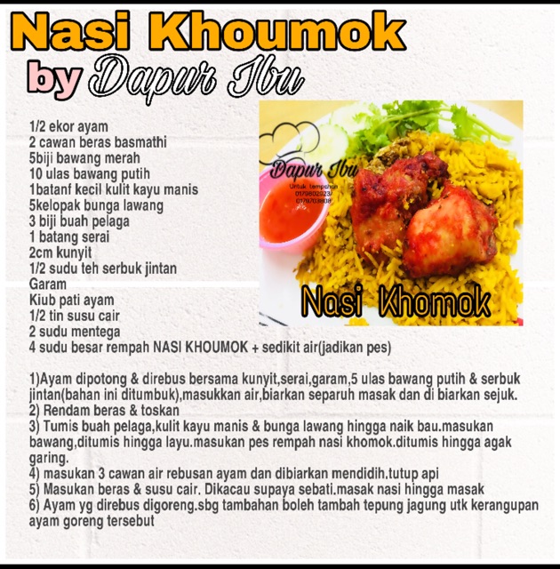 Nasi komok aka khao mok gai aka nasi beriani siam, begitulah sebagaimana yang di nyatakan berkenaan nasi ini. Ia juga dikenali dengan nama lain seperti khao mok gai, nasi minyak thai dan beriani thai. Hidangan ini berasal daripada indonesia, walaubagaimanapun, ianya menjadi popular. See more ideas about food, recipes, tasty thai. Sebenarnya ternampak nasi ni bila link kongsi resepi kat bawah tu flashed kan nasi ni kat websitenya.curious sangat apa nasi ni kita terus klik, then terus memang sedap sangat nasi ni.pada kita rasanya ada sedikit macam nasi beriani & ada juga macam rasa nasi ayam.its a combine cross over. Tiba masa untuk qh mencuba sendiri memasak nasi komok thai ni.ianya juga dikenali nasi beriani thai atau dalam bahasa siam khao mok gai / khao mok kai.biasa beli je yang dah siap.balik rumah tinggal ngap jerrr.kali ni semuanya buat sendiri tau.inilah kali pertama. Nasi komok merupakan sejenis hidangan yang berasal dari thailand. Khao mok kai | thai berianiподробнее. .resepi masakan nasi #aneka resepi nasi #cara buat rempah komok #khao mok gai rice #masakan thai #nasi biryani thai #nasi khoumok siam #nasi komik rantau pantai timur #resepi masakan thai #resepi nasi beriani siam #resepi nasi khao mok thai #resepi nasi komok kota bharu #resepi. Nasi komok di kenali juga sebagai khao mok gai dalam bahasa siam atau juga nasi beriani siam.cara penyediaannya hampir serupa dengan nasi ayam.yang sumber:azlitamasammanis.com thanks bagi yang tiada rempah komok boleh di buat sendiri mengikut resepi ini. Mencari resepi nasi yang ringkas dan mudah dibuat? > resepi nasi khao mok thai. Harga shipping tidak termasuk , akan dikira selepas bayaran nasi dibuat.